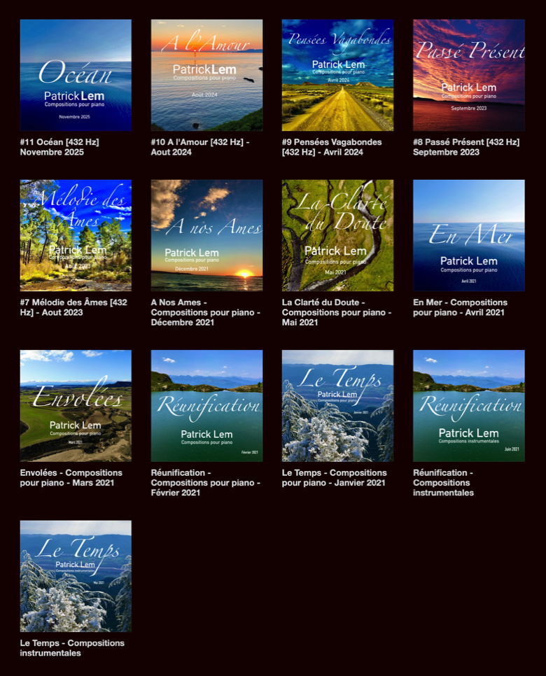 Mes albums sont disponibles sur mon espace BandCamp https://patricklem.bandcamp.com
